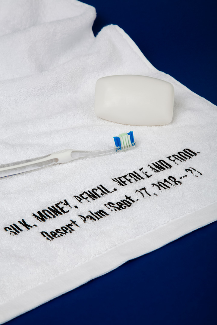 데저트팜의 개업 1주년을 기념하기 위해 만든 수건입니다. 기계자수로 새긴 단어들은 돌잡이상에 올리는 몇 가지의 사물로, 각각 장수(長壽) · 부(富) · 영민함 · 손재주 · 배곯지 않음을 염원합니다.